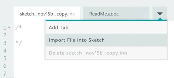 Open the ‘layout.png’ and ‘schematic.png’ tab. These illustrations will show you how to put together your electronics. When you are working on your own projects, you can add your own documentation images by clicking on the last tab of the code area and choosing ‘Import File into Sketch.’