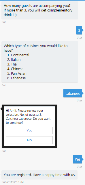 That's all regarding the usage of FormFlow in ChatBot application. In next articles, we will look into implementation with a combination of Dialogs and FormFlows. Until then, keep chatting with your bot!