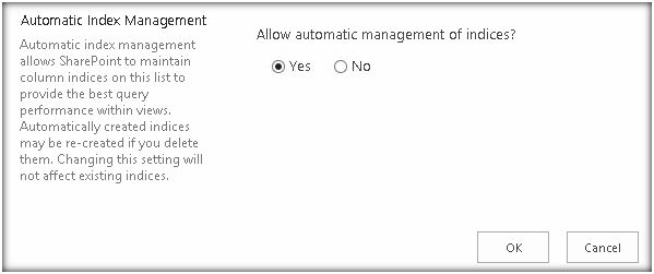 In the list setting, a new setting has been introduced to make the list available for indexing by the above timer job: “Automatic Index Management” must be set to “Yes” for the timer job to include the list for auto indexing the columns.