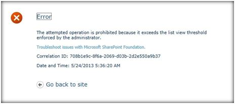 SharePoint by design has a threshhold limit imposed on large lists, which is set to 5000. If any query or view returns more than 5000 items at any point of time, the error, in the form of a message, would be thrown, shown below: