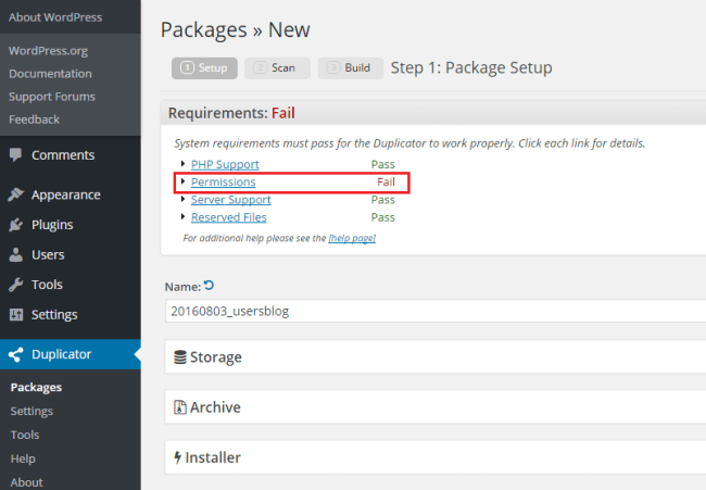 I installed “Duplicator” plugin to create a backup of my site, but it gave me an error. Is it a plugin issue, you asked? No! Not at all. Your OS should give read/write permission to PHP (WordPress plugins are written in PHP) for the specific user, where your WordPress instance is installed. You can read more about Linux Permissions.