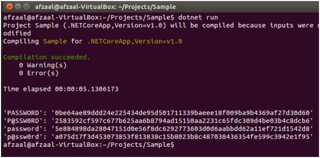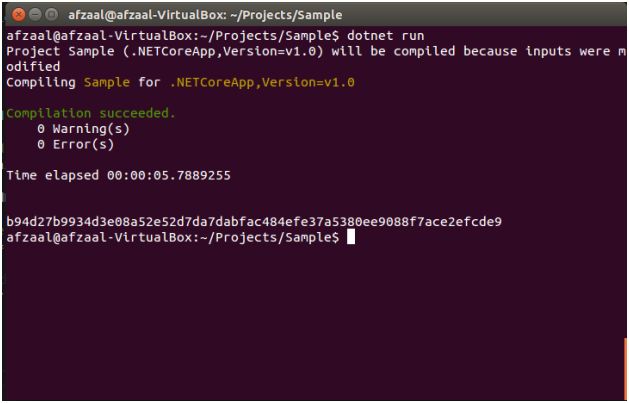 Figure 3: Result of the above shown code in C# being executed in Ubuntu terminal on .NET Core runtime