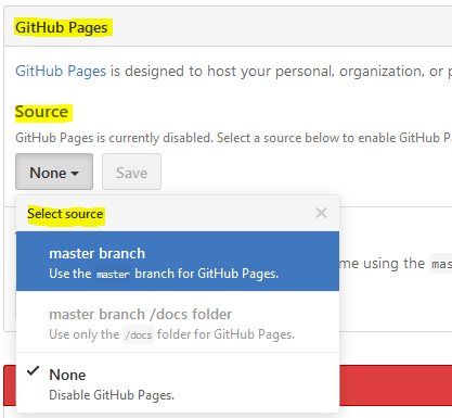 Once the settings page is loaded, scroll down to the "GitHub Pages" section under the "Source" label, select the branch of your repository from which you want the website to be rendered. The default selection will be "none" - meaning your repository is not currently enabled for GitHub Pages.
