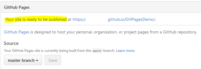 Once you click on "Save", immidiately GitHub creates a website of your repository from selected branch and it is readily available. Note down the url given by GitHub - you will use it to visit your website.