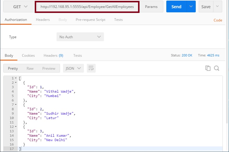 In the preceding screenshot, the GetAllEmployees hosted Web API REST method is returning all the employee lists.