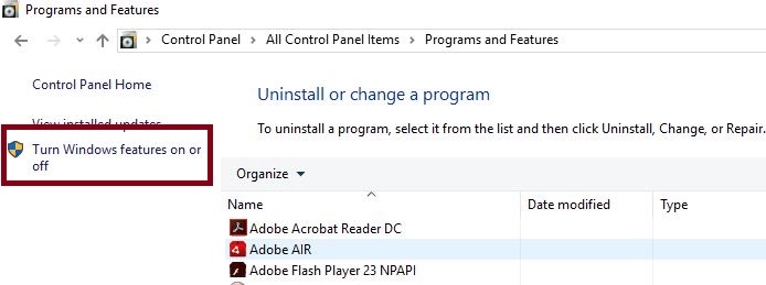 - This shows the list of installed programs. Find and click the "Turn Windows feature on or off" option from the left pane, as shown in the following image.