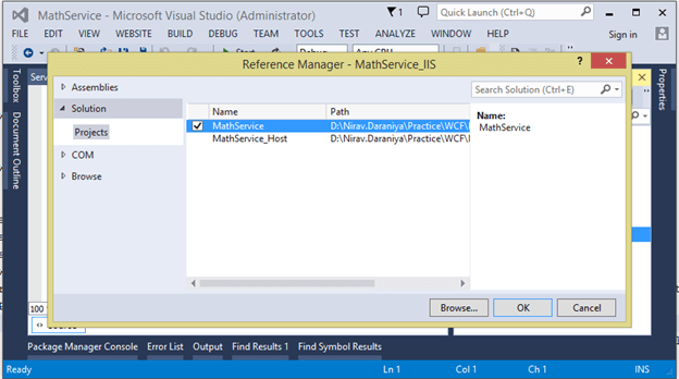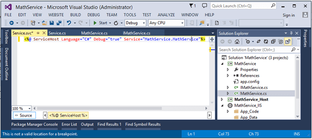 - Open “MathService” WCF Service project with administrator rights (Run as Administrator) and then, add new web site (MathService_IIS) to its solution, as shown below.