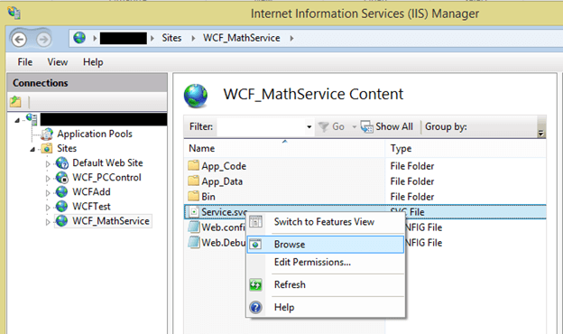 - Now, right click on ‘Service.scv’ file and go to ‘Browse’. This will open Service URL ( http://localhost:7777/Service.svc ) on browser.