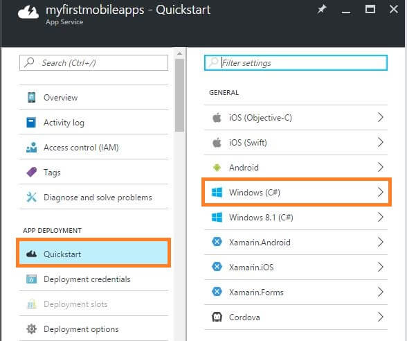Step 5 - In the new "Mobile App Settings" blade, click Quickstart and select Windows(C#).