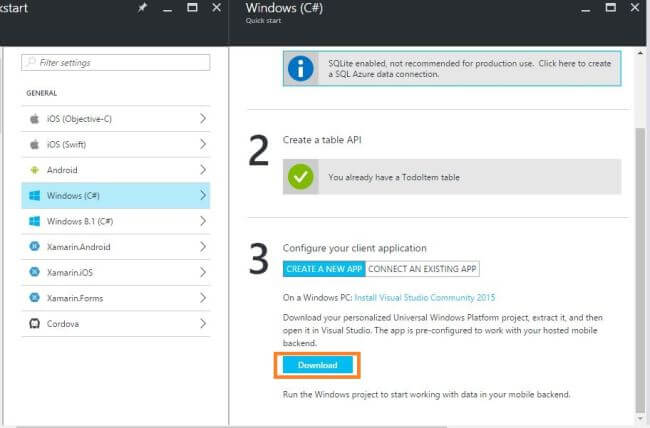 Step 6 - In the Quickstart blade for your Mobile App backend, select "Create a new app" and click "Download".