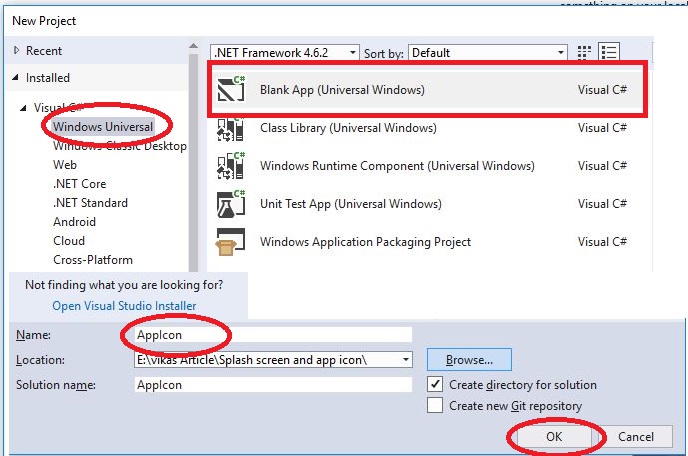 The "New Project" window will pop up. Select Blank App (Universal Windows), name your project, and click OK.