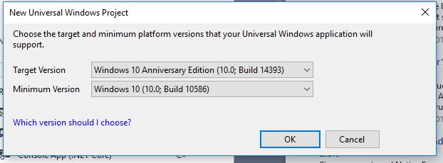 A new Universal Windows Project window will pop up. Select target version and minimum version and click OK.