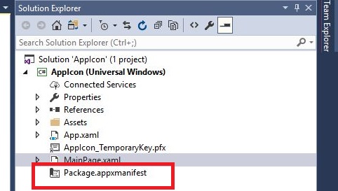 Once your project is created, open Solution Explorer and click on Package.appxmanifest.