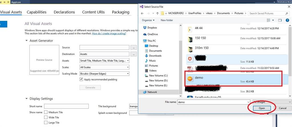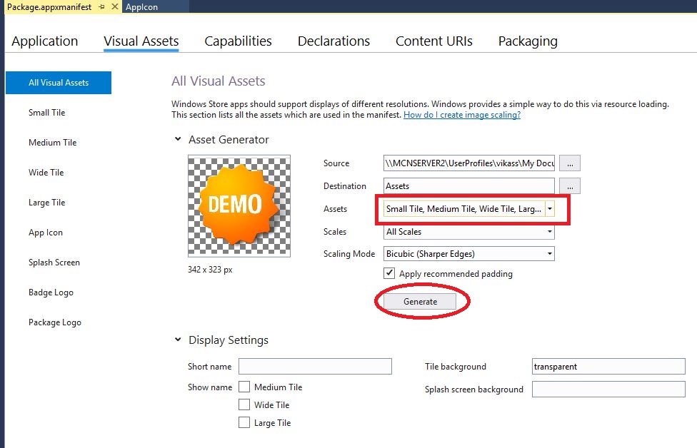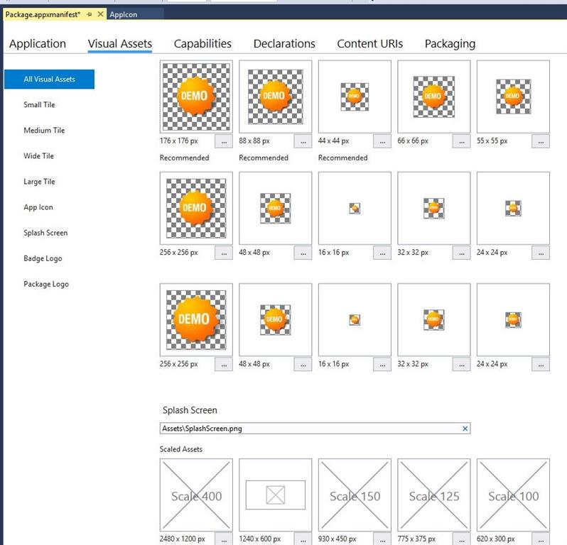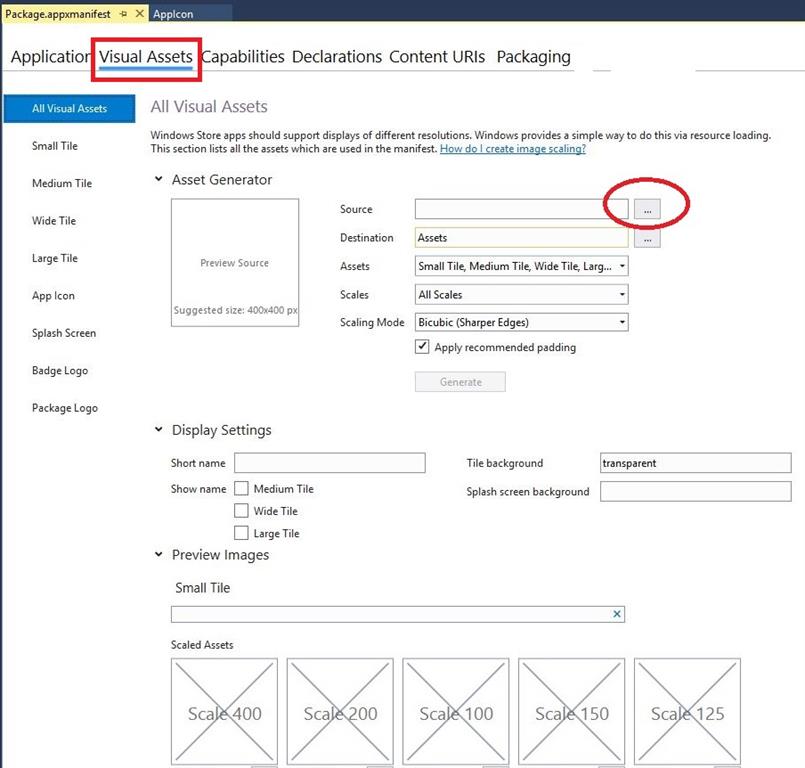 Next, you will see Package.appxmanifest screen. Just click on "Visual Assets". It will show all visual assets. Just click "Source".