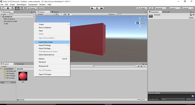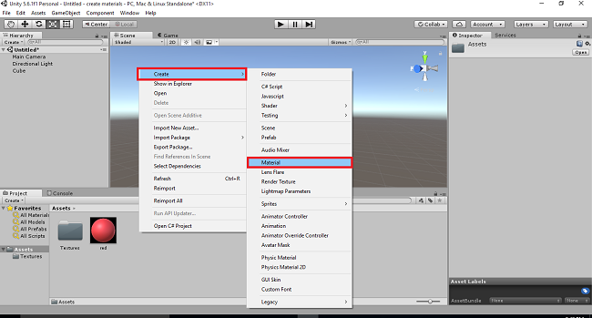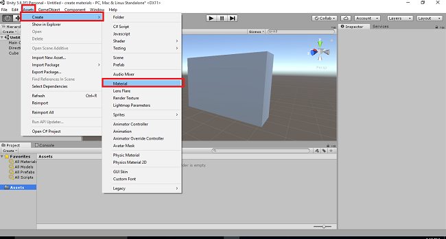 Select the Assets menu in menu bar. Select "Create" and pick the "Material" option.