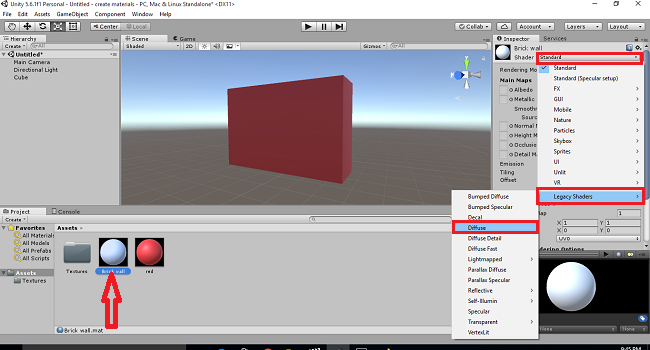 Select the Brick wall and go to standard list box. Choose the Legacy shaders and pick Diffuse option.