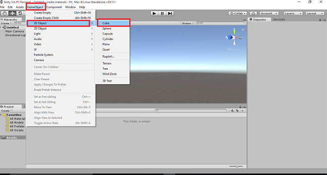 Select the GameObject menu in menu bar. The GameObject Menu has several objects to create a game. Select 3D object and pick the cube option.