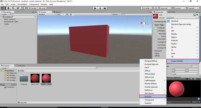Now, select the red material and go to standard list box. Choose the Legacy shaders and pick specular option.