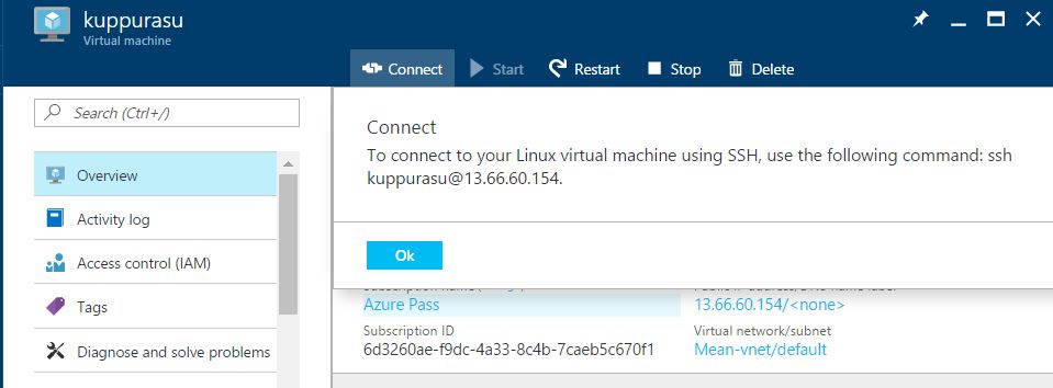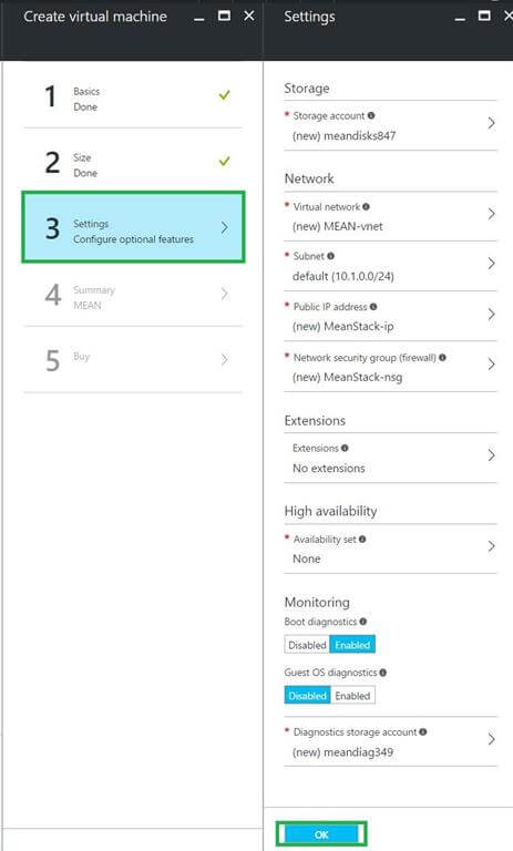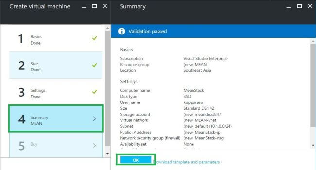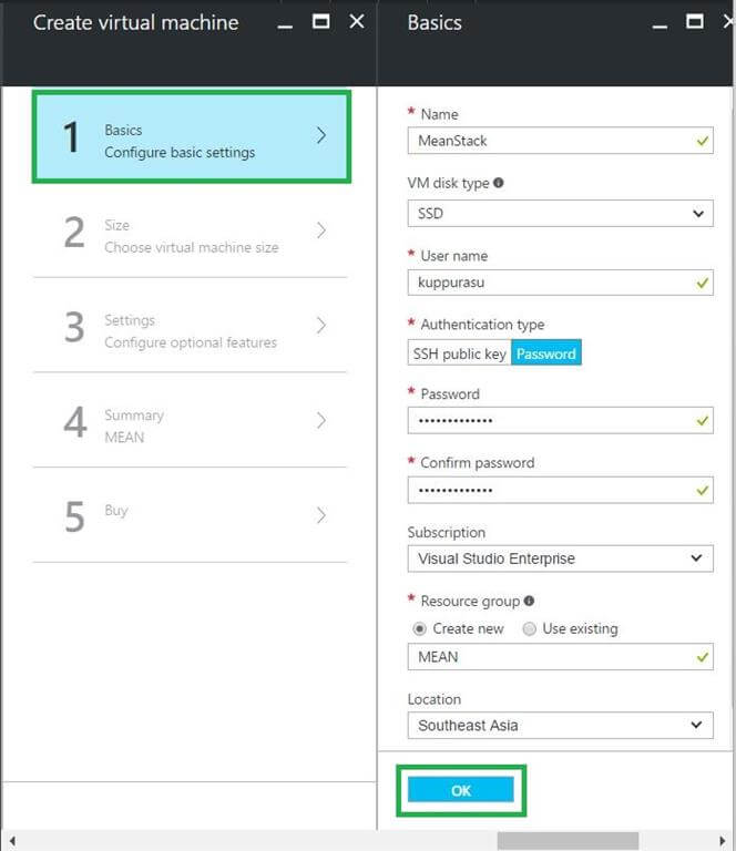 New Create Virtual Machine blade and provide the required following values for configuring our MEAN Stack. Click OK to continue to the next section.