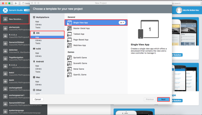 Click New Solution—> select iOS—>select app--> choose single View app. Afterwards, click Next.