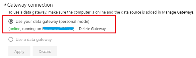 From Gateway Connection, click on “Use your data Gateway (Personal Mode)”.