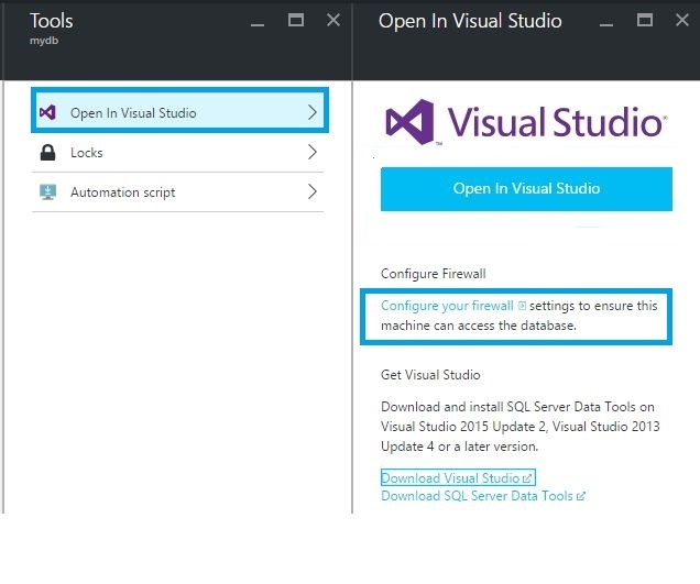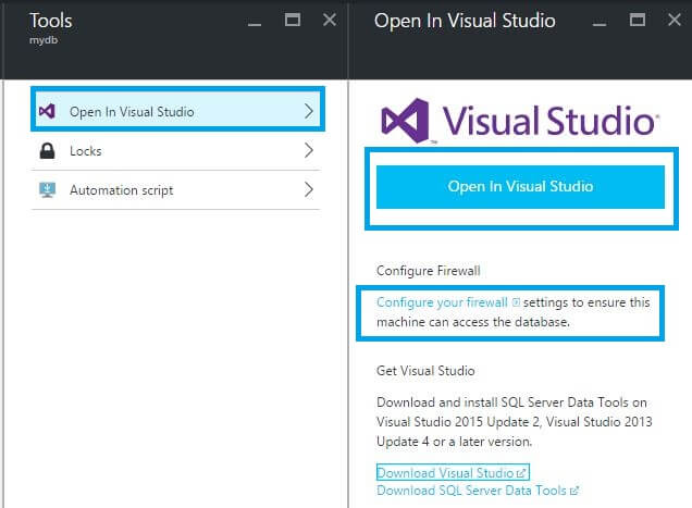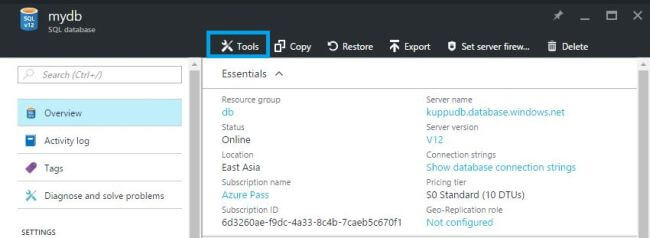 2. Open the existing database on Azure portal and click "Tools" button at the top of the database blade.