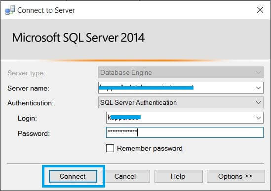 5. Next, Visual Studio opens with "Connect to Server" window, already set to connect to the server and database that we selected in the portal. Type your server admin password and click "Connect".