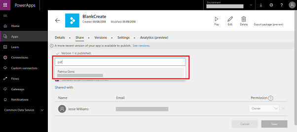 - You can share an app from powerapps.com but not from PowerApps Studio. (Click or tap the Share icon in PowerApps Studio to open powerapps.com).