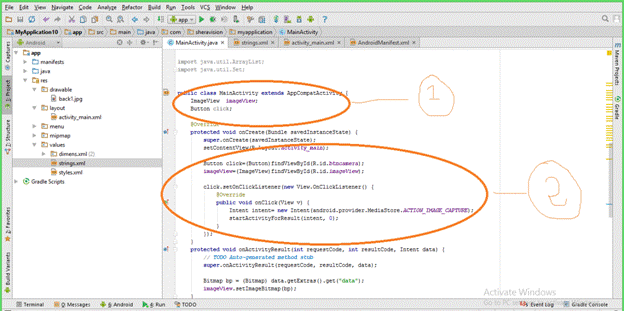 - Ask for permission for using the camera to hardware using intent (Java code).