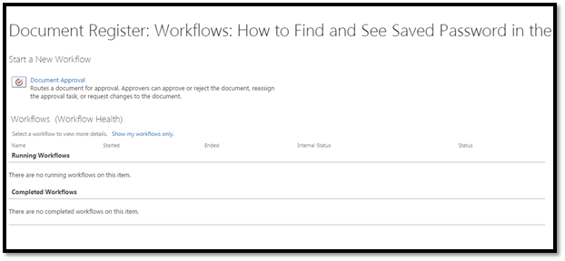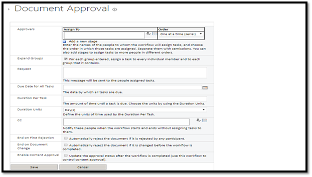Now, click on "Document Approval" as shown below, which will navigate to the page where Workflow is going to start. If any changes are required, you can do that and click on "Start", as shown below.