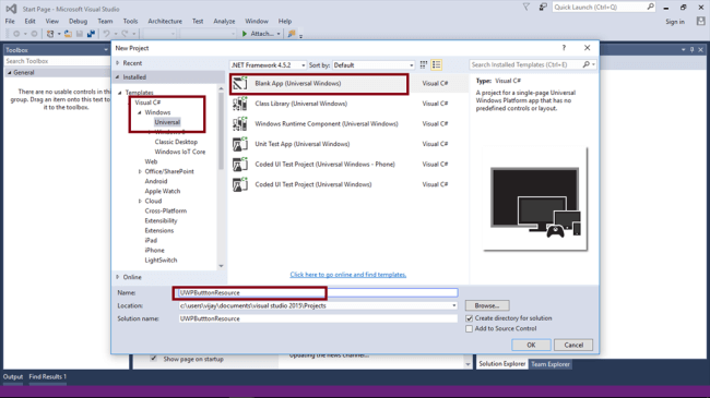 Step 1 - Open Visual studio 2015 -> Start -> New Project-> Select Universal (under Visual C#->Windows)-> Blank app -> Give the suitable name for your app (UWPButtonResource)->OK.