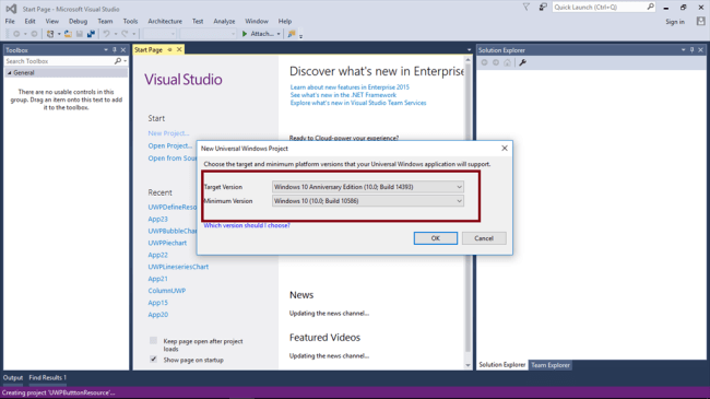 Step 2 - Choose the Target and minimum platform version for your Windows Universal Application will support. Afterwards, the project creates App.xaml and MainPage.xaml.