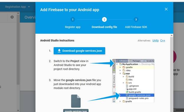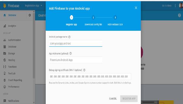 Register the app by clicking the button. For adding fire base in your android app you should download google-services.json file. And move the  google-services.json file you downloaded in to your android app module root directory. And it is given in  Figure 11.