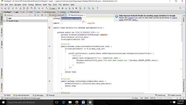 We will get the package name by opening android project in android studio. And then go to MainActivity.java , Copy the package name as show in the figure given below. And paste in the package name column.