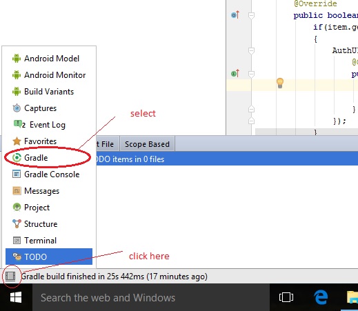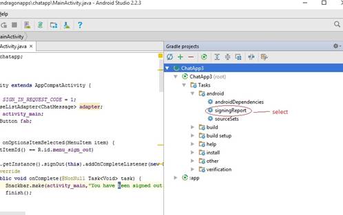 On opening gradle we can see some options associated with our project. And there you will find the android option and then sign in report as sub option. And the step is shown in Figure 8.