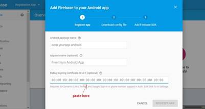 Again  you can see a register window with android package name, nickname, debug sign in certificate SHA1.