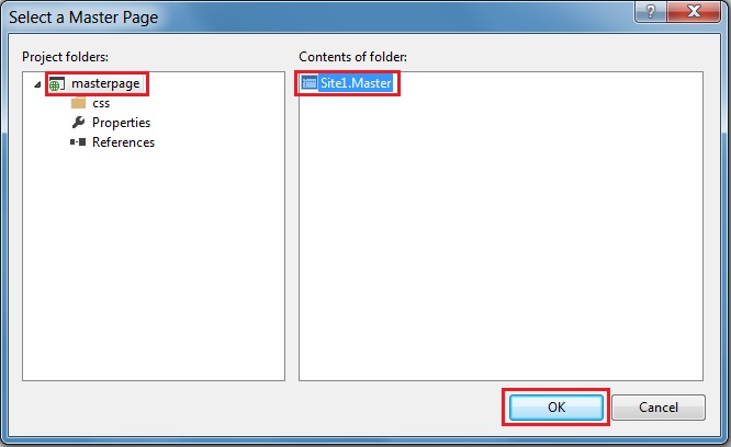After clicking on that, add the button Window, open the selected masterpage->site1.master and click OK.