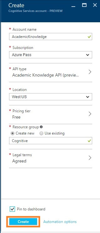 In the new account blade, enter the Account Name, select Subscription and select API type as Academic Knowledge API from the list of available API's.