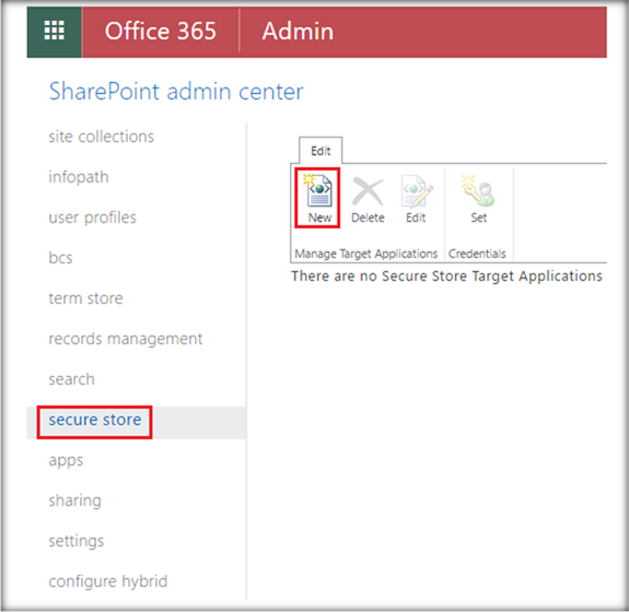 In order to get started with Secure Store target application creation, head over to SharePoint Admin Center. From Secure Store, Select ‘New’.