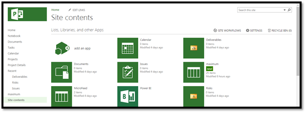Click on project site link which is on left side quick launch, upon clicking the project site, then we can see a page as below.