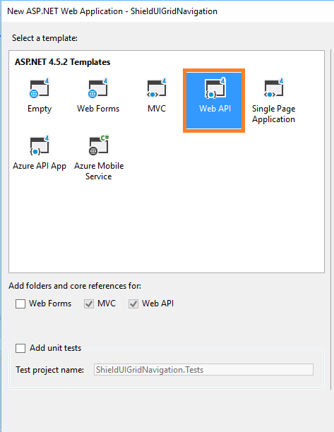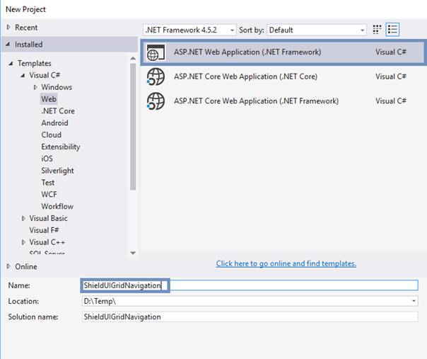 Open Visual Studio (in my case, I’m using VS 2015 Community) and select File -> New -> Project. In the popup window, select ASP.NET Web Application (.NET Framework), name it as you like, and click OK. I named it ShieldUIGridNavigation.
