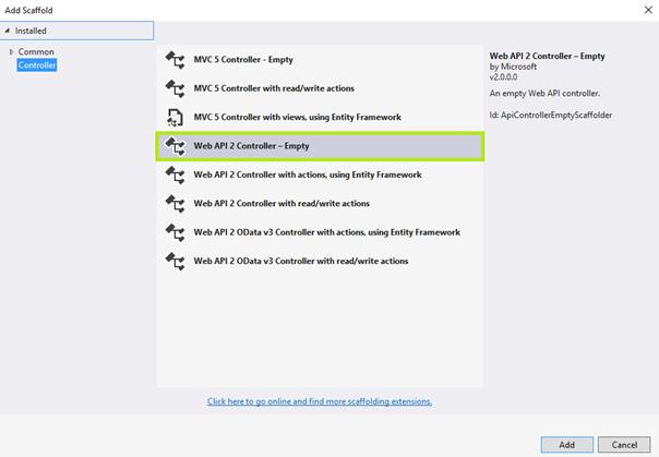 Head to the Solution Explorer -> Right click on the “Controller” folder -> Add -> Controller and select Web API 2 Controller – Empty as shown in the figure. Name it CarsController.cs.