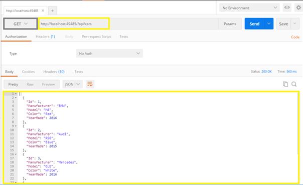 Using Postman, we will test if the API is returning the list without any errors by making an request of type GET to api/cars, as shown in the figure. If everything is fine, we should get the list in JSON format.
