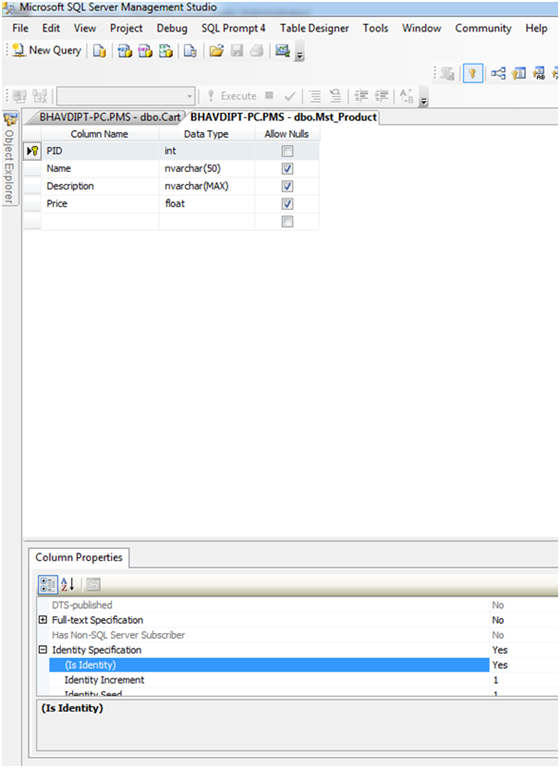 Create the new Database and table in SQL server. The database name is "PMS" and table name is "mst_Product"