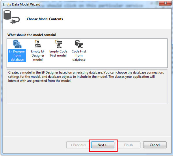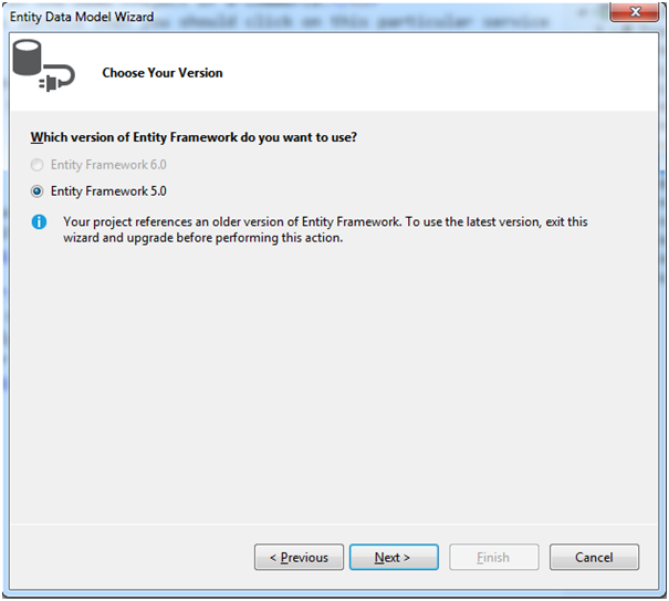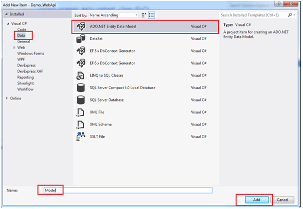 Add the model in this project: right click on this model, add new items, then select data and choose the ado.net entity data model and assign the name of this model and click on ok button