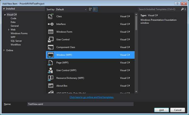 - Create a View named ‘TestView.xaml’ in Views folder.