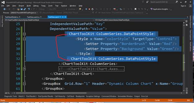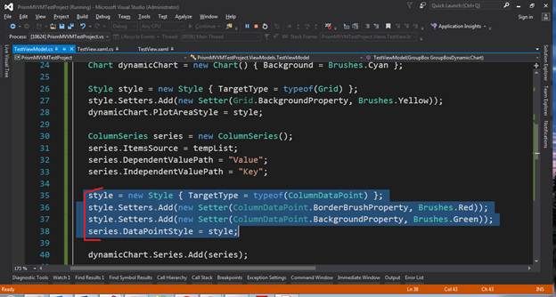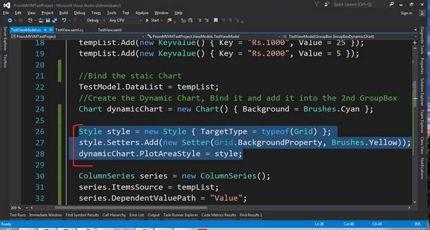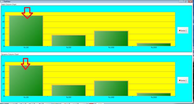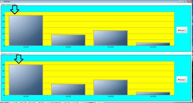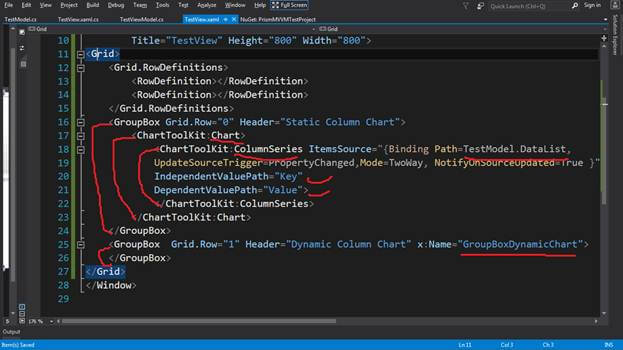 - Create 2 group boxes with different header names for static and dynamic charts respectively, where the first will contain a chart with a column series with an itemsource, IndependentvaluePath and DependentvaluePath property.