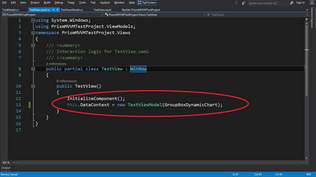 Add PrismMVVMTestProject.ViewModels namespace and bind Data Context of TestView page to the ViewModel named ‘TestViewModel’. and pass the second groupbox into it.