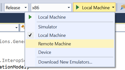 - In Visual Studio, build mode to Release, x86, and Remote Machine.
