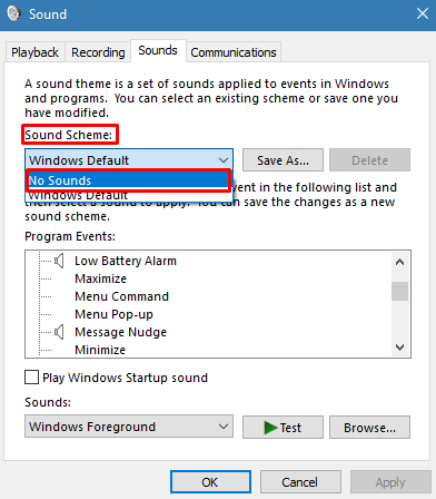 Step 6 - There, under the Sound Scheme, select No Sounds.